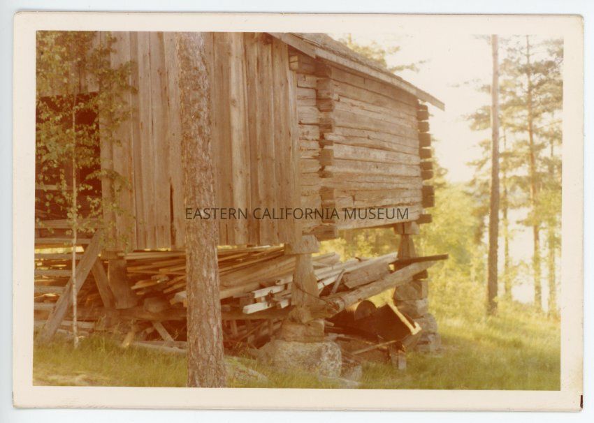 Color photo of a wooden building raised above the ground with lots of lumber stored beneath it. The structure of the building looks like stacked Lincoln Logs. Thin trees, grass visible.