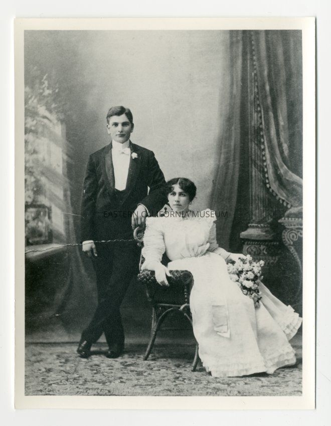 Copy of a full-length studio portrait of a man and woman. They are identified on the envelope as Carl and Frieda Walters.