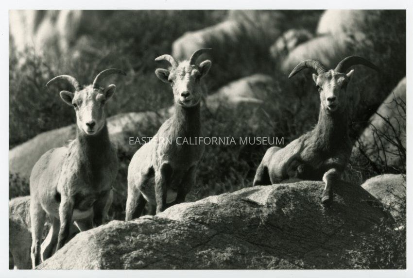 This photo was included in John D. Wehausen's chapter titled, "The Historical Distribution of Mountain Sheep in the Owens Valley Region," which was published in the book, "Mountains to Desert: Selected Inyo Readings," which was published by the Friends of the Eastern California Museum in 1988. It is image #16 on page 104, and its caption says, "Three bighorn in the Sawmill Canyon herd."
