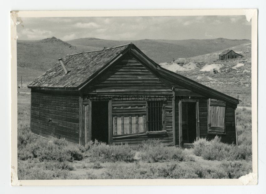 Photo of the old jail at Bodie. Note the bars on the window. Written in pencil on reverse: Jail. Stamped on reverse with photographer Walter P. Ward's information. Neg. No. B-102.
