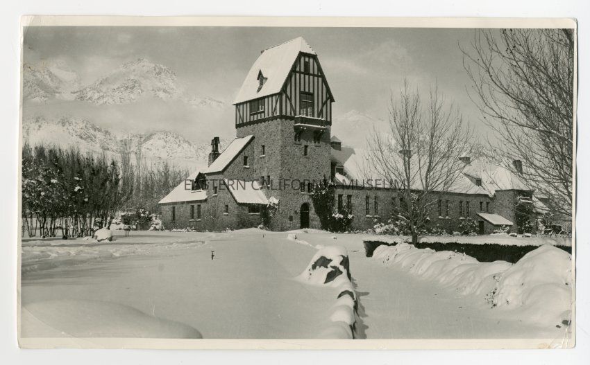 Photo of the Mt. Whitney Fish Hatchery covered in snow. It was purchased by Mrs. Louise Parcher.