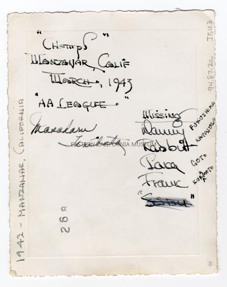 Written in black ink on reverse is: "'Champs' Manzanar, Calif, March, 1943, AA League." Also written on photo edge: "1943 - Manzanar, California" and a list of names. Under the title of "missing" are the names Danny Fukashima, Rabbit Kayasuga, Paco [sp?] Goto, and Frank Kuramoto. One more name is listed: "Masaharu Tanibata [sp?]."Photograph Details