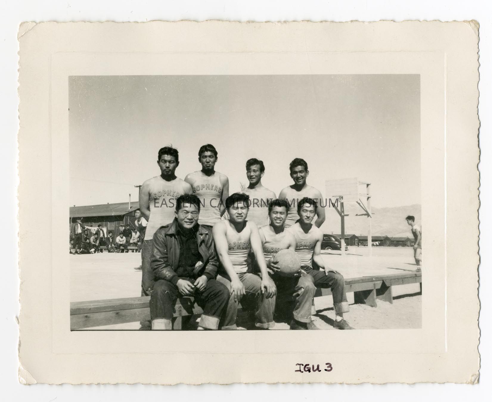 Exterior photograph of 8 young men who are part of a basketball team. 7 are wearing sleeveless uniform shirts with the name: "Gophers" on them. One man is wearing dark shirt and jacket, possibly a coach or manager. Behind the group is the basketball backboard, and behind that barracks are visible.