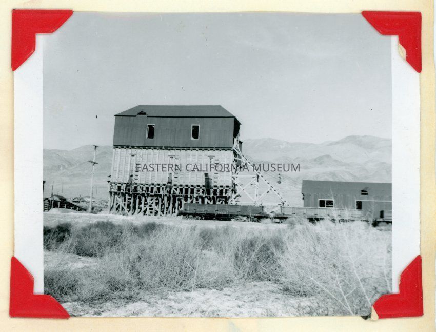 Photo of the Cerro Gordo and Keeler tramhouse, ore bins, and warehouse. There are two railroad cars in front of the building. Photo taken by C. Krautter in 1959.