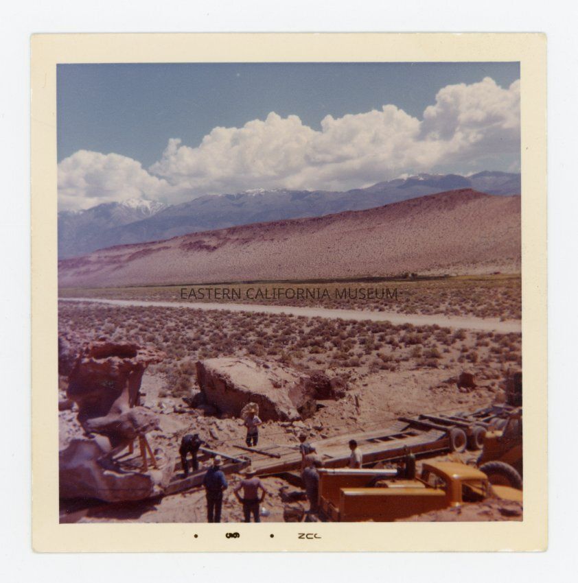 This photo is of a crew working to load up the selected tuff [tufa] formation onto a flatbed trailer.Collection