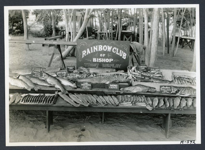 [No label, but it is described in the inventory as "Rainbow Club of Bishop, display of fish from various camps, mainly Mono County." Signs on the trout display include Culvers Camp, June Lodge, Cherokee Lodge, Boulder Lodge, Earl Proebstel Guide, Carsons Camp, Rush Creek, Silver Lake, Grant Lake, and one for Frasher's Sierra Photo Shop in June Lake.]