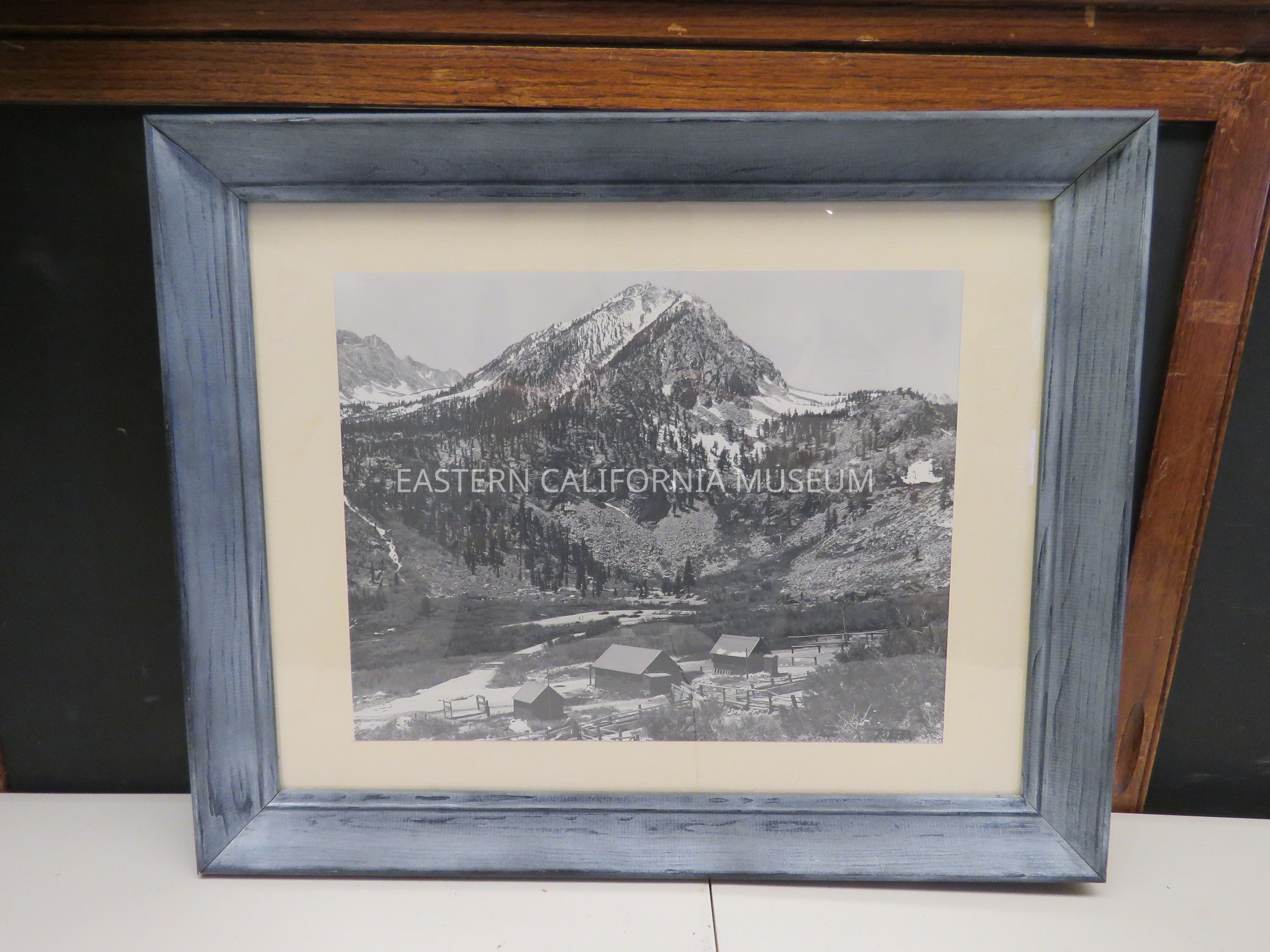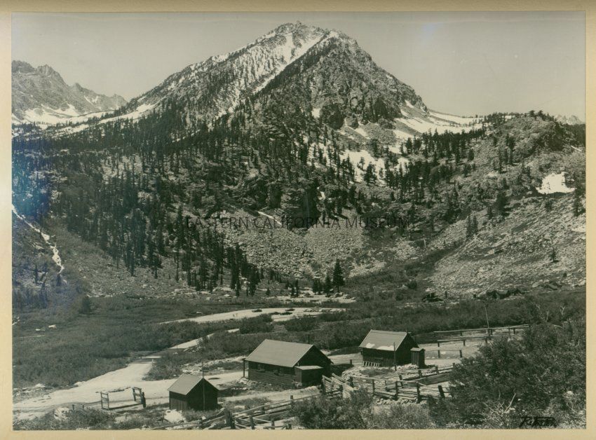 Framed photograph taken by the donor, Ralph W. Posten, of Onion Valley pack station. Shows three buildings, corrals, and a parking lot with vehicles in it. Mountain peak with some snow rises above in center.