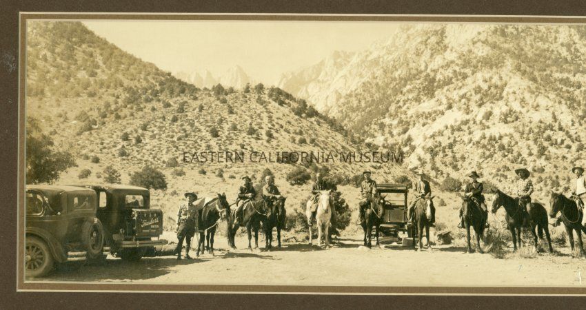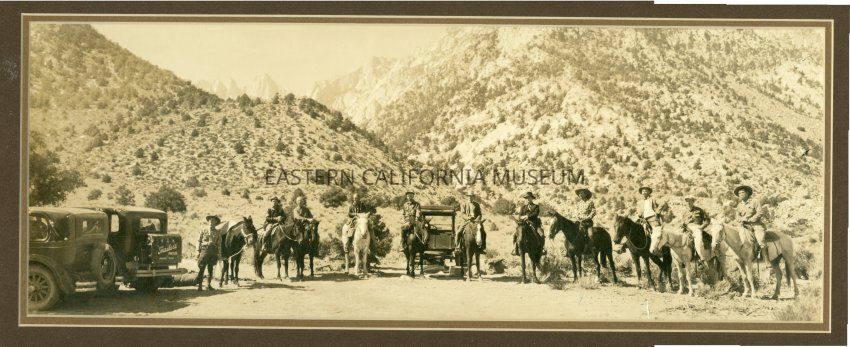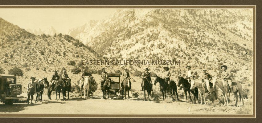 There is a small blue ink arrow pointing to the man fourth from right; maybe Raymond W. Spear? The accession paperwork says Raymond is wearing the large white cowboy hat. Burton Frasher is on the far left next to his vehicle. The man fifth from right looks like William Chalfant, and several of the other man in the photo look familiar or were seen in other photos with Chalfant (around a campfire, in a tram bucket, etc.).Collection
