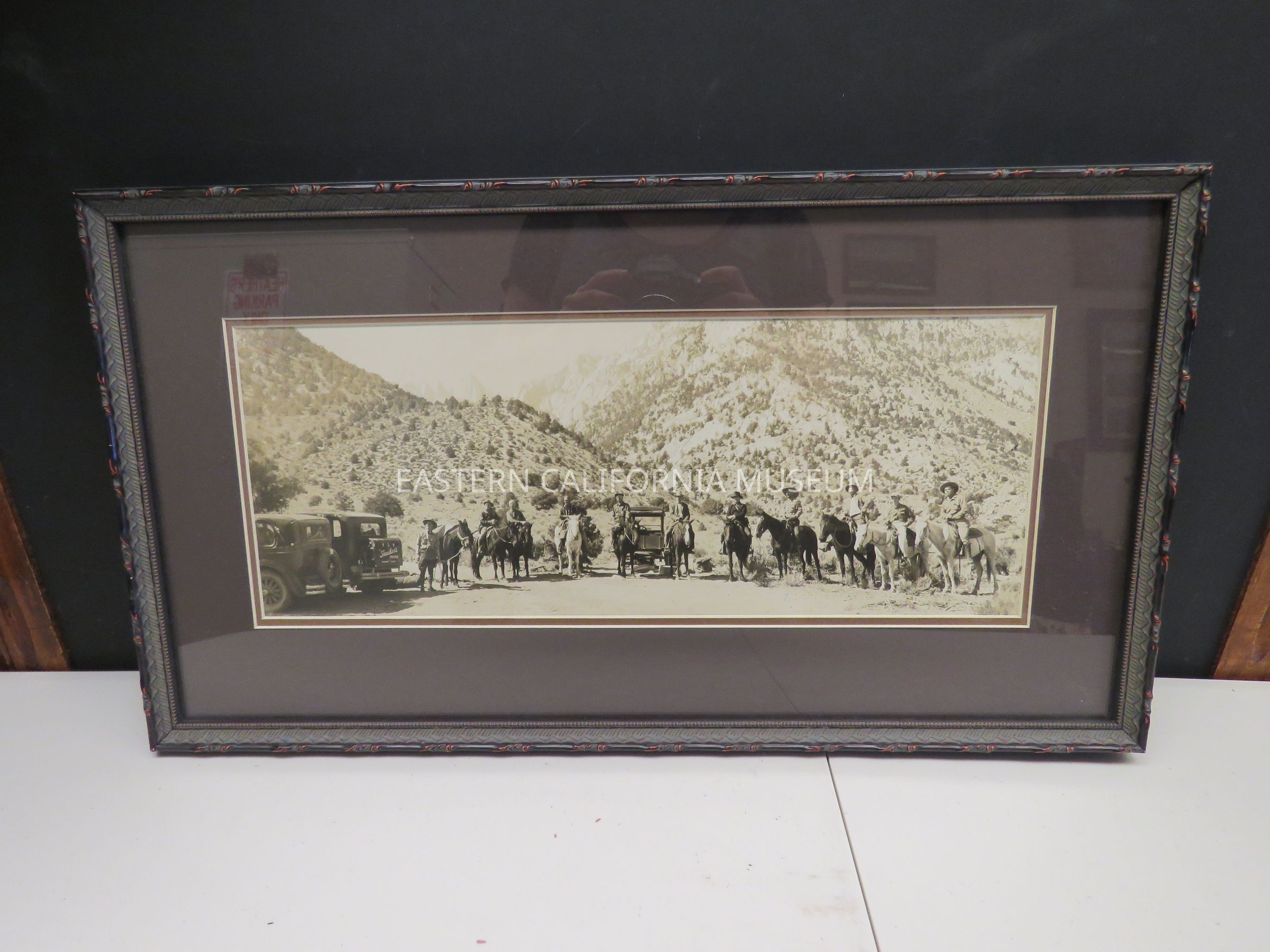 Framed photo of a pack train at the base of the mountains with Mt. Whitney in background. Raymond W. Spear and Frasher are in the photo, which was taken circa 1926.