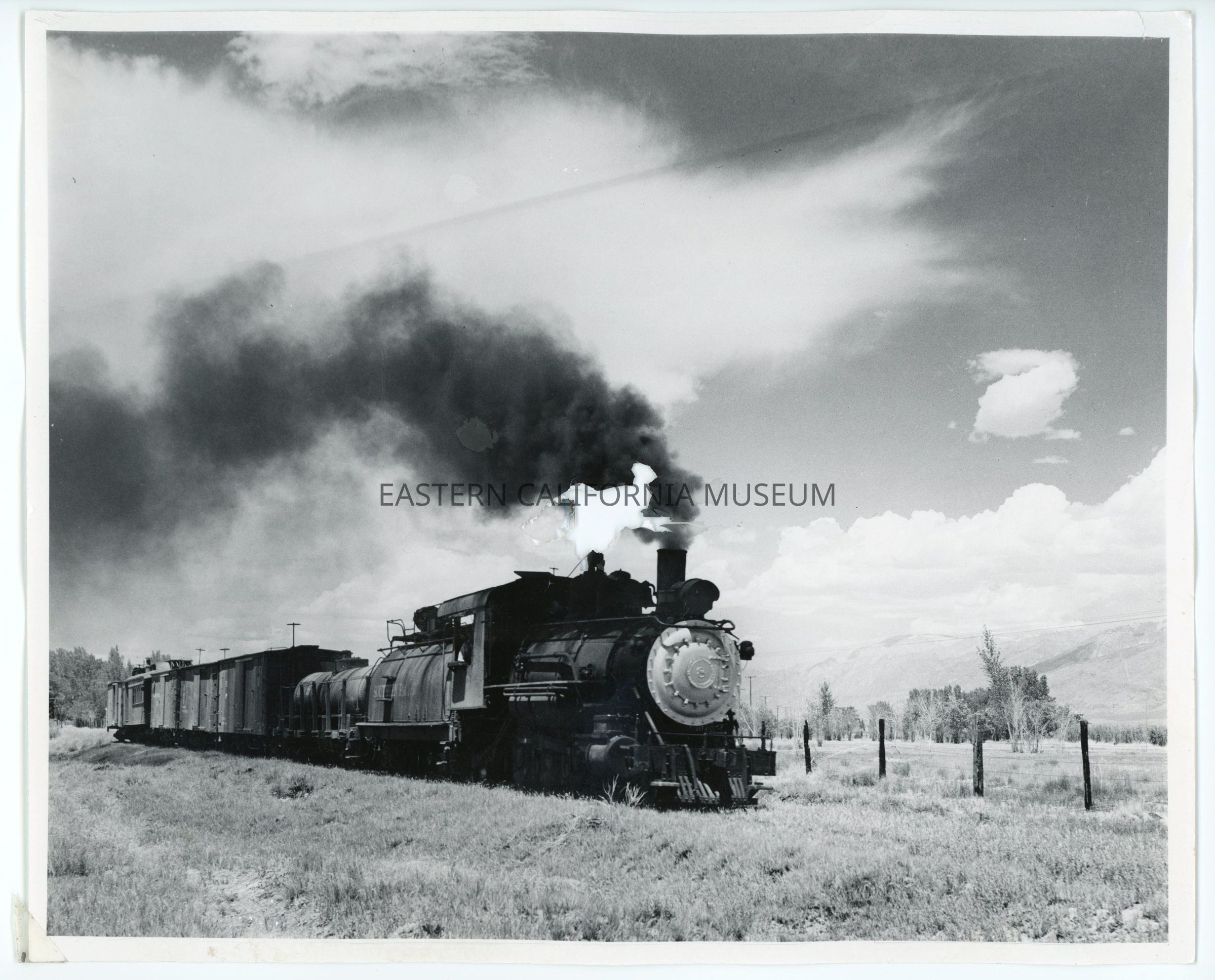 Photo of Southern Pacific narrow gauge #8 steaming out of Laws heading south with tender, boxcars, and caboose in tow.