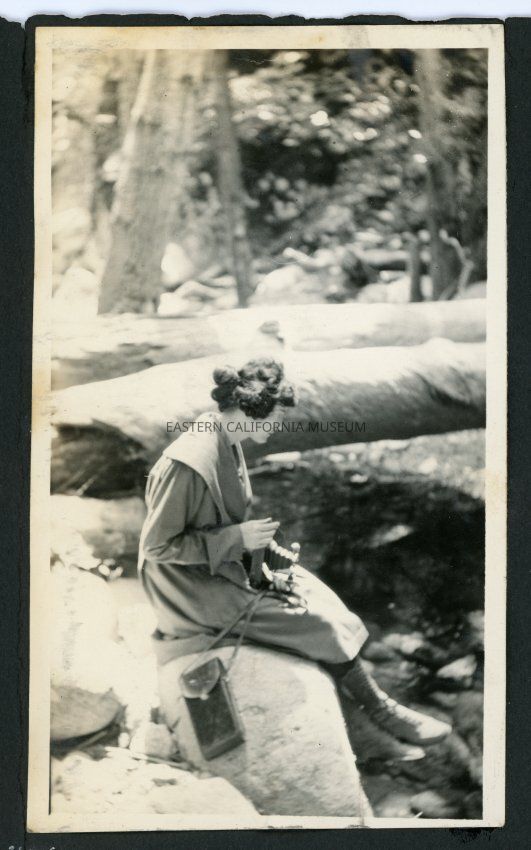 Photo of a woman holding a folding camera sitting on a boulder. She is wearing a dress with calf-high boots. There are boulders or logs behind her.
