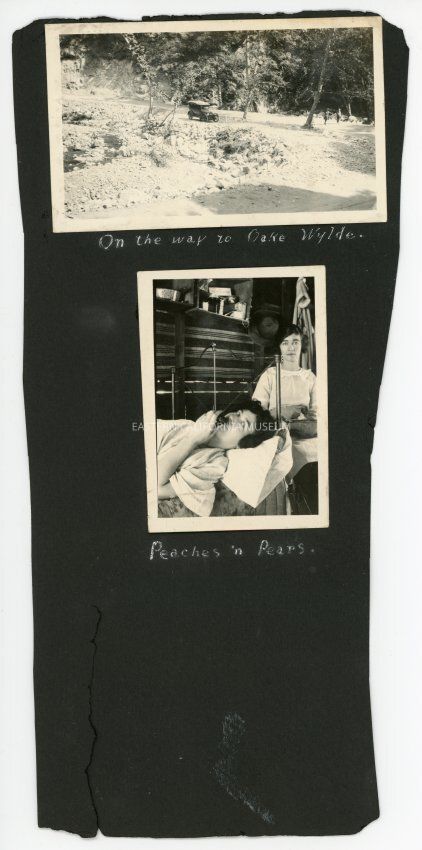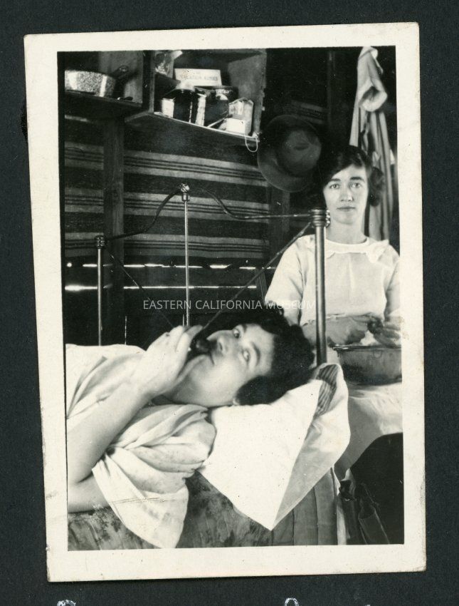 Photo of two women inside a cabin. One is laying on the bed and the other is sitting behind her in a chair. They are eating fruit.