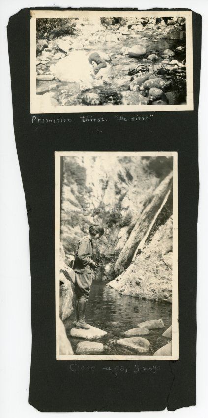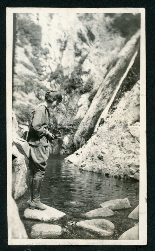 Photo of a woman standing on a small rock or boulder in a stream taking a photo with her collapsible camera. Steep mountain sides surround her.