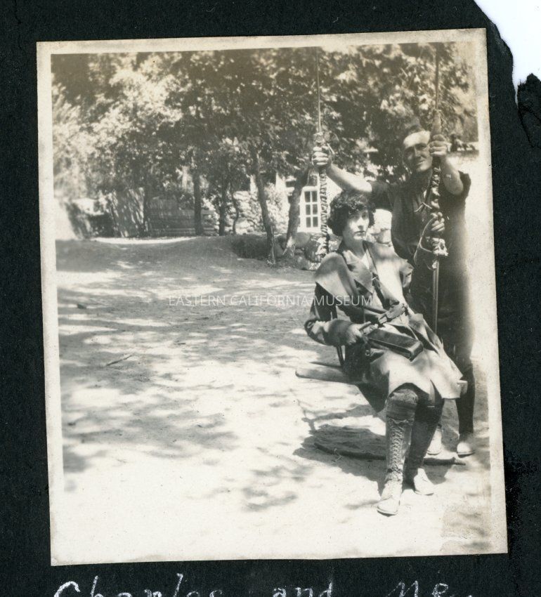 Small square photo of a man and woman with a swing. There is a house or structure in the background.