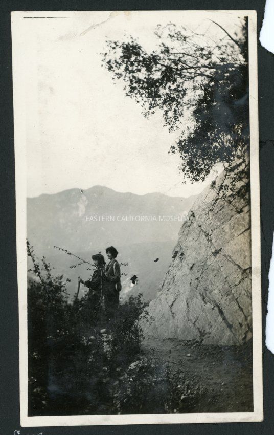Photo of two women with walking sticks on a dirt trail. Large rock behind them, brush in foreground.