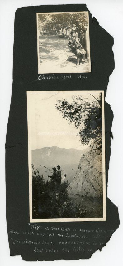 Caption in white: "Why do those cliffs of shadowy tint [illegible] / More sweet than all the landscape with [illegible, paper gone] / 'Tis distance lends enchantment to the [paper gone] / And robes the hills on [paper gone]."Collection