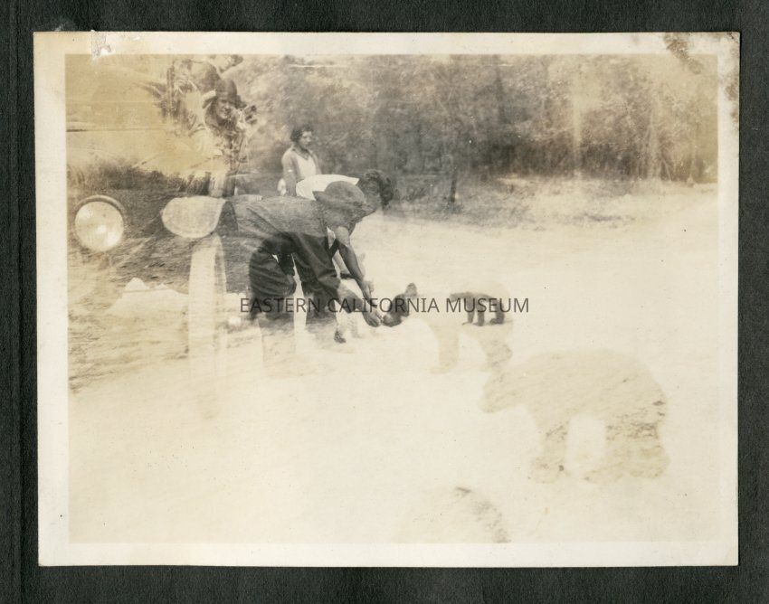 Double exposed photograph. One image apperas to be of a vehicle and a bear cub on the road. The other image appers to be of two people bending over feeding or petting a couple of bears.Collection
