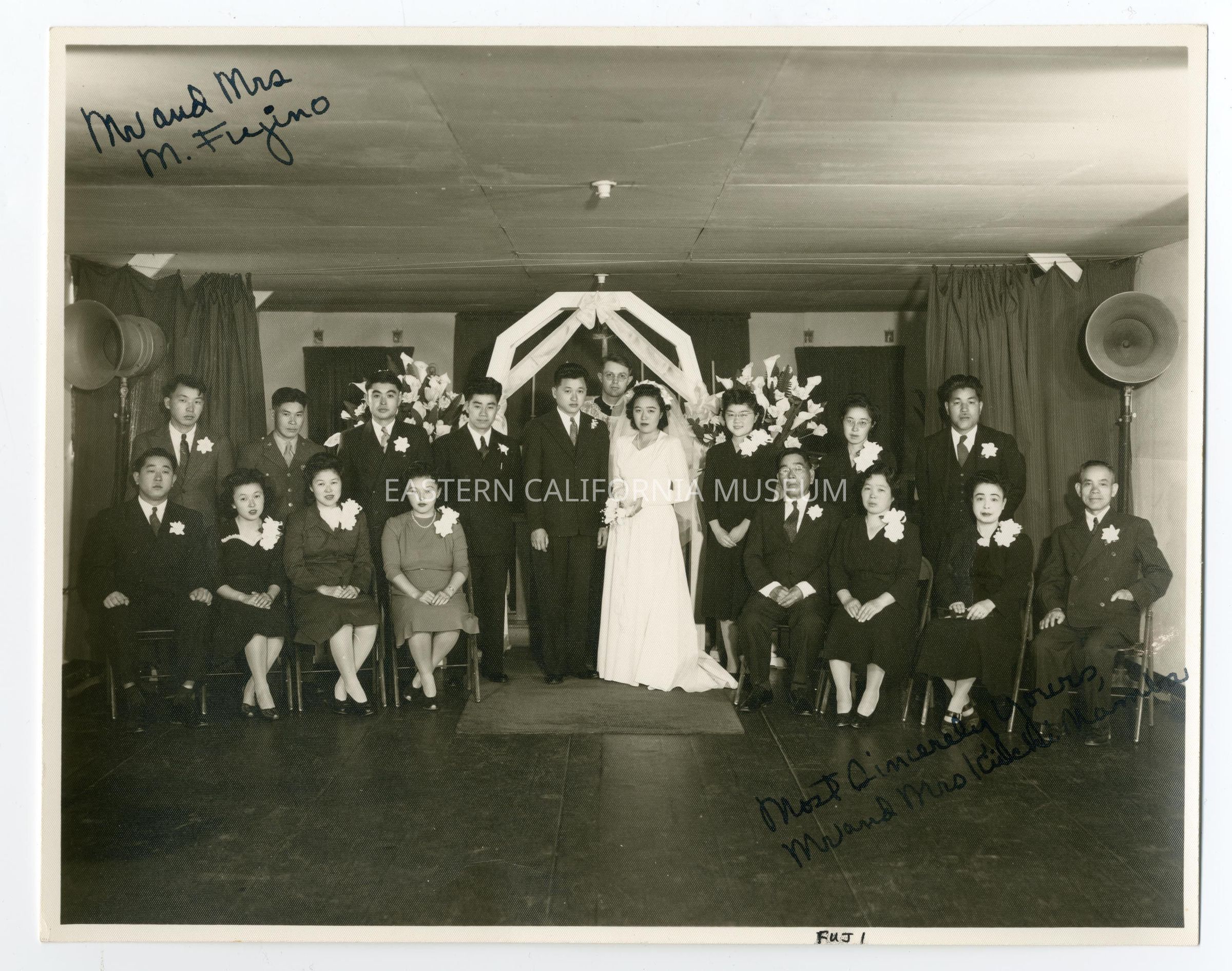 An interior photograph of a wedding party with the bride and groom in the center, in front of a clergy member. On either side of the couple are 15 people in two rows, front row sitting and back row standing. All are dressed in suits and nice dresses with one young man wearing a military uniform. In upper left corner of photo in black ink is writing; "Mr and Mrs M. Fujino." In bottom right corner of photo in black ink is written: "Most Sincerely ours, Mr and Mrs Kiichi Namba." Label adjacent to photo says: "Marriages of the Namba Family 21-11-4."