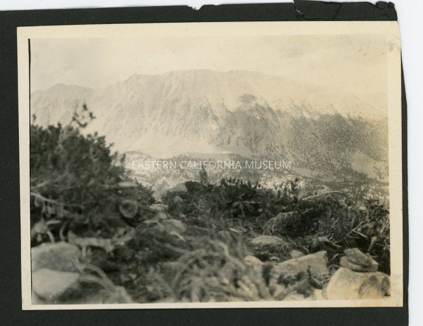 Photo of a woman standing in front of a mountain. There are boulders and some shrubs or ground covering in the foreground, so not high altitude.Collection