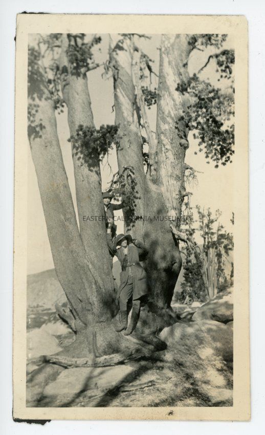 Photo of two women posing next to a large tree. One has climbed up a ways, while the other is standing on the roots.Collection