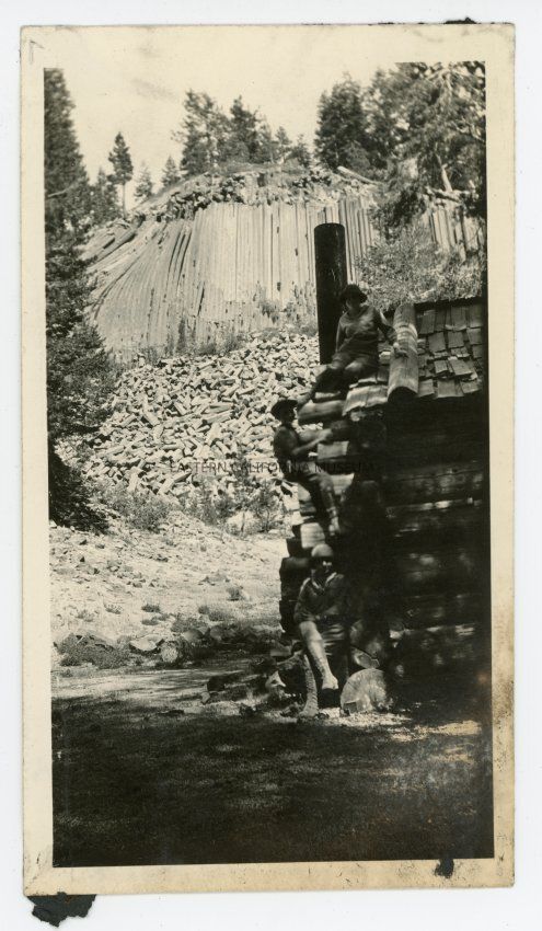 Photograph of three people posing next to the cabin by Devils Postpile National Monument.Collection