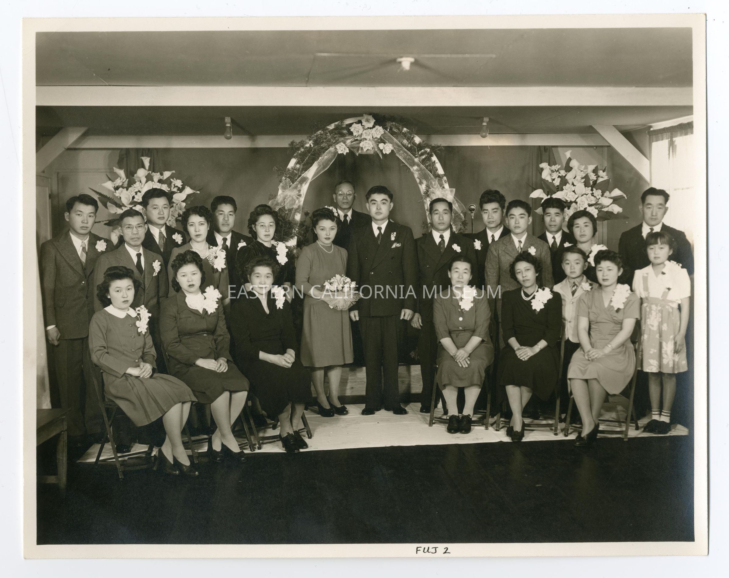 An interior photograph of a wedding party with the bride and groom in the center, in front of a clergy member. On either side of the couple are 20 people in two rows, front row sitting and 2 rows standing behind them. All are dressed in suits and nice dresses. Label adjacent to photo says: "Marriages of the Namba Family 21-11-4." On rear of photo is written: "Mr. + Mrs. Fujino, Sincerely yours, Mr. + Mrs. Geo. Tsuda."Photograph Details