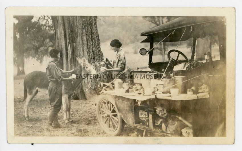 Photo of two women feeding leftover food to two mules/donkeys/burros. There is a car that is set up like a table or sideboard with food and supplies.Collection