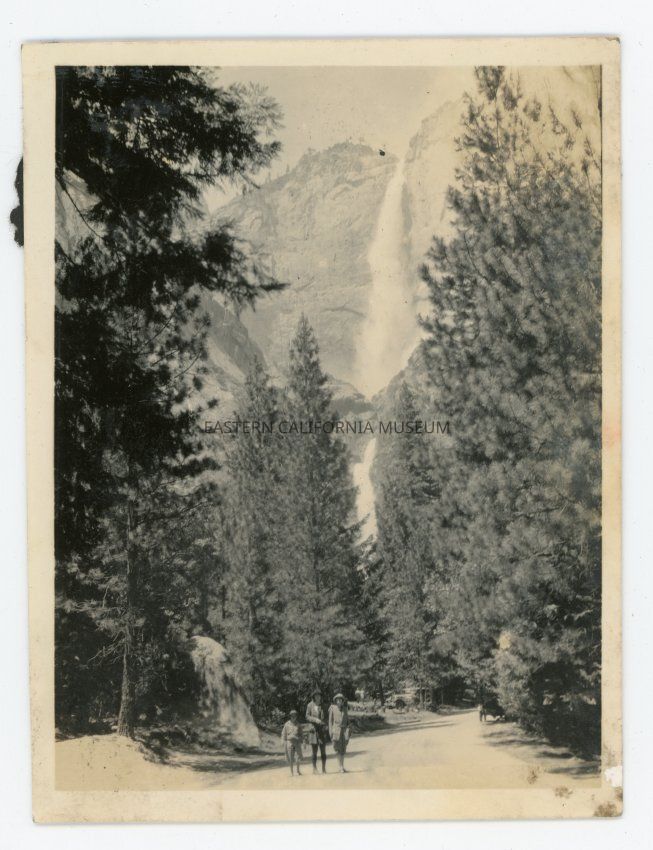 Photo of three people standing on a dirt road near the base of Yosemite Falls.