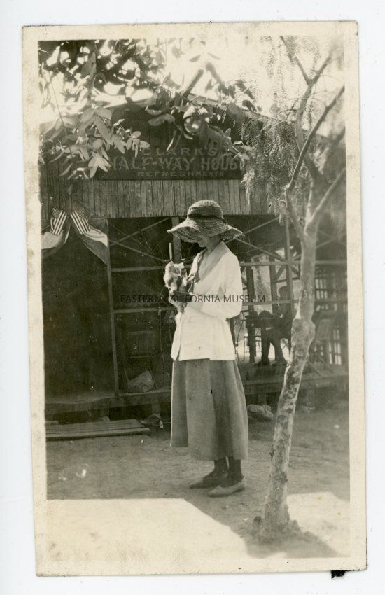 Photo of a woman holding a kitten. She is standing in front of Clark's Half-Way House, which is an open cabin-like structure.Collection