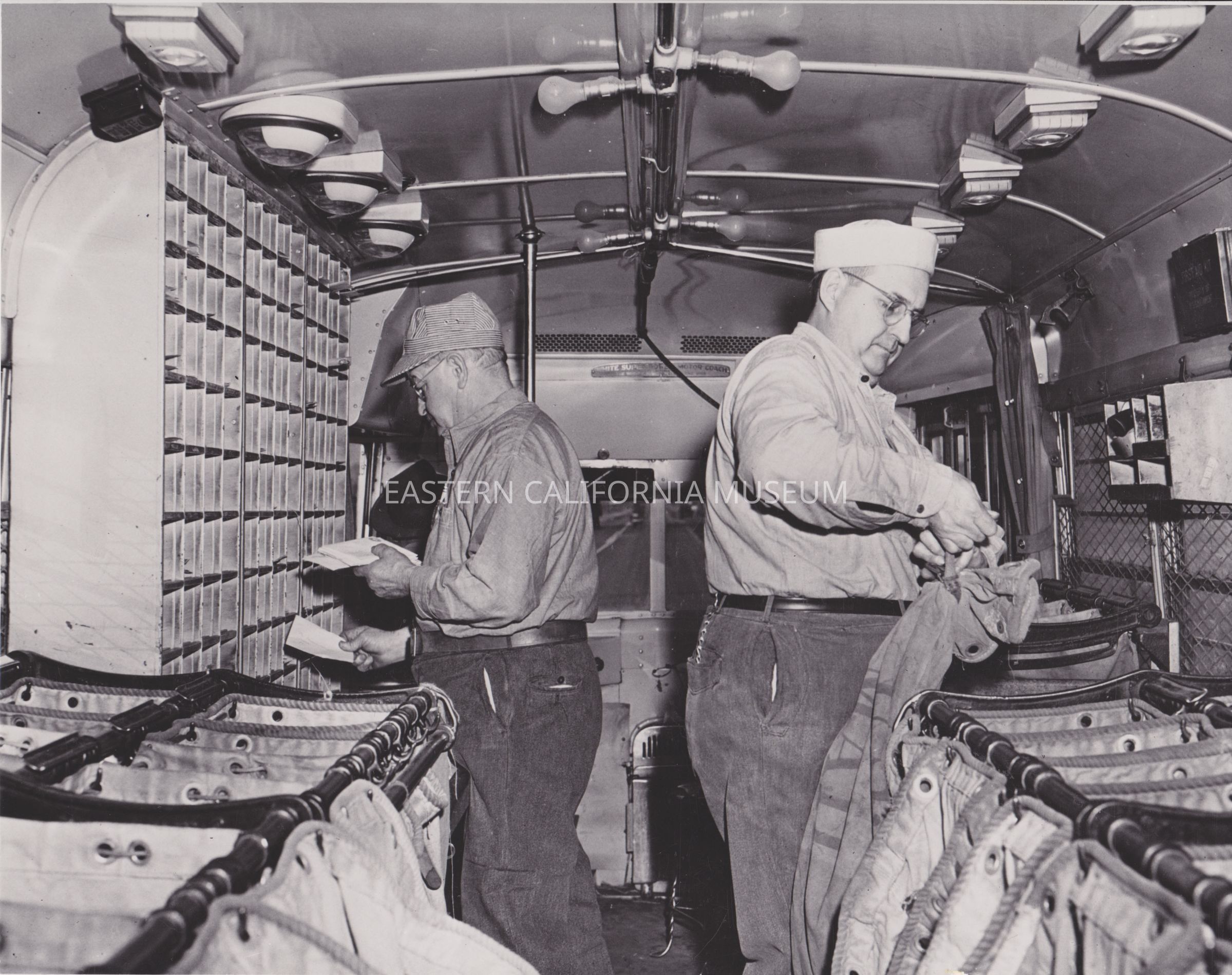 Black and white photo of two men sorting mail inside the Highway Post Office during its stop in Independence on its inaugural tour from Los Angeles to Bishop, July 14-15, 1952.