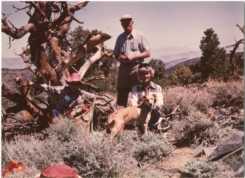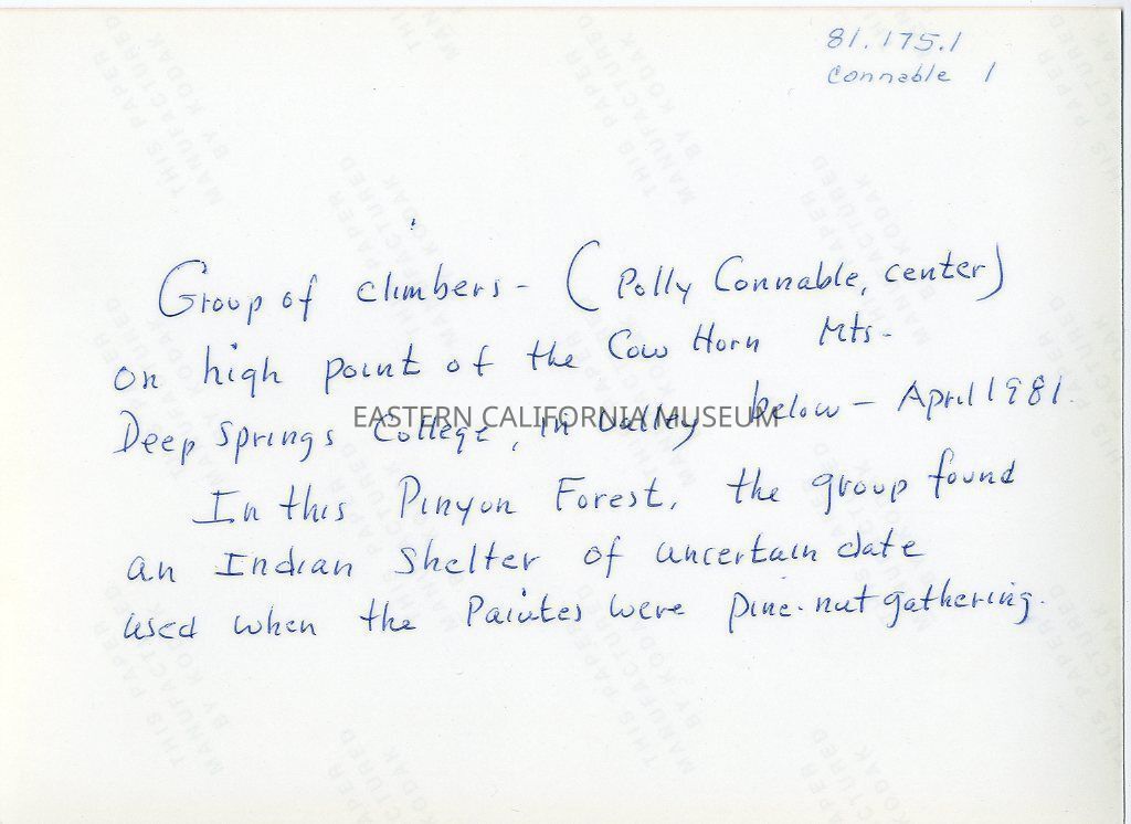 Written on reverse: Group of climbers (Polly Connable, center) on high point of the Cow Horn Mountains. Deep Springs College in valley below. April 1981. In this Pinyon forest the group found an Indian shelter of uncertain date used when the Paiutes were pine-nut gathering.