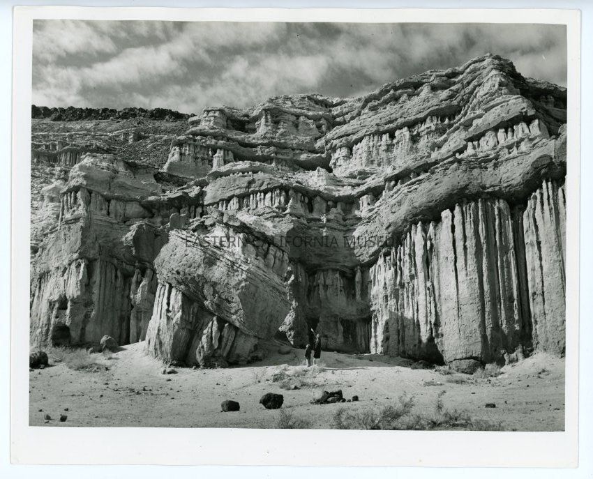 Photo of two people looking up at the rock formations in Red Rock Canyon. Label on reverse: Red Rock Canyon, 19 miles north of Mojave on Highway 14. Photo 1956.