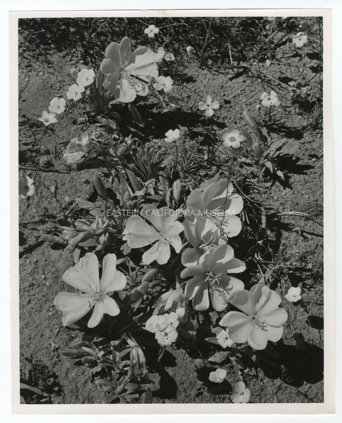 Close-up photo of blooming flowers. Label on reverse: Evening primrose, Devil's Playground, near Kelso. Also has "109" handwritten in red pencil on reverse.