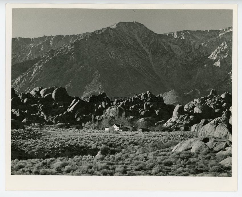 Photo of a house or ranch in the Alabama Hills area. Handwritten in pencil on reverse: Whitney Portal Road c. 1930.