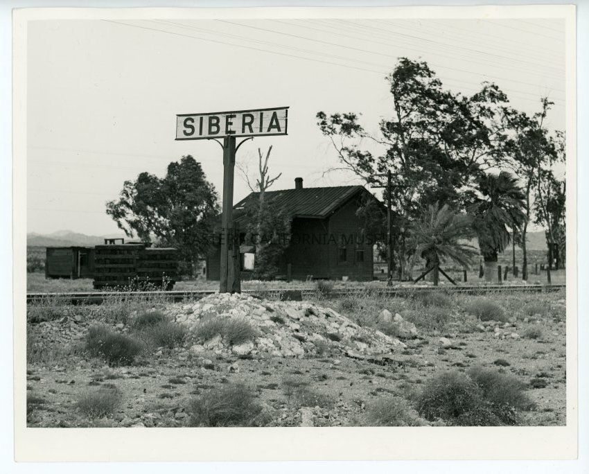 Photo of a house or station by railroad tracks. A sign in the foreground says, "Siberia." Label on reverse: Siberia, on the railroad between Ludlow and Amboy. Photo 1938.