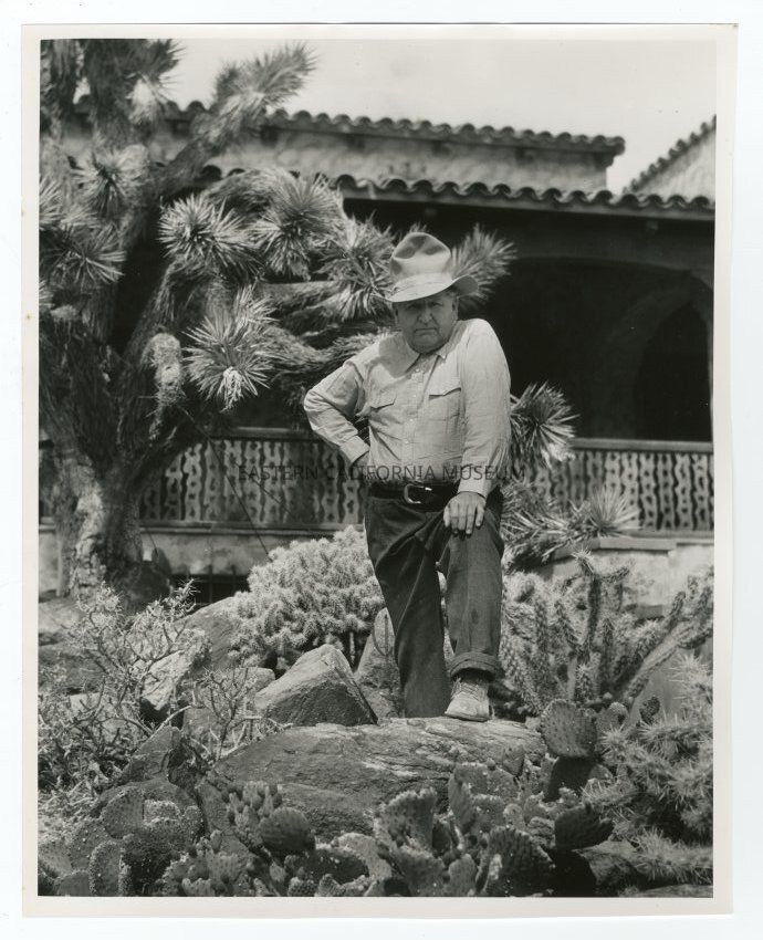 Photo of Death Valley Scotty posing in a cactus garden in front of Death Valley Scotty's Castle. Label on reverse: Portrait of Scotty at the Castle. Photo 1934.