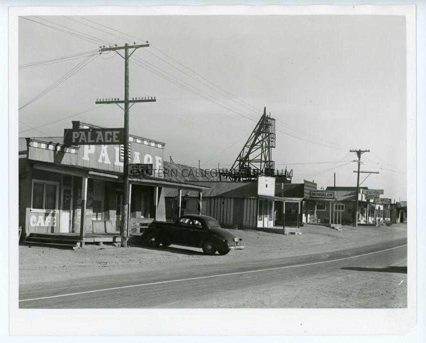Photo of storefronts along a road. Signs for Palace Cafe, Bungalow, Bert's Barber and Beauty Shop, and Shamrock. Label on reverse: Red Mountain. Photo 1938.