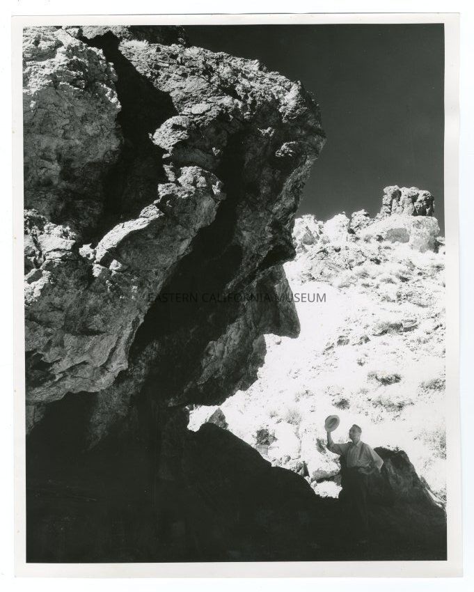 Label on reverse: The stone face at Cave Spring. The man doffing his hat is Fred Bender, a German mining engineer, who was a claims recorder at Cave Spring 1905-1907, returned for a visit. Photo 1932.