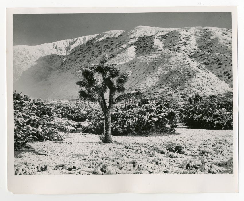 Photo of a joshua tree covered in show. Label on reverse: Snow on the Mojave near the eastern approach to Tehachapi pass.