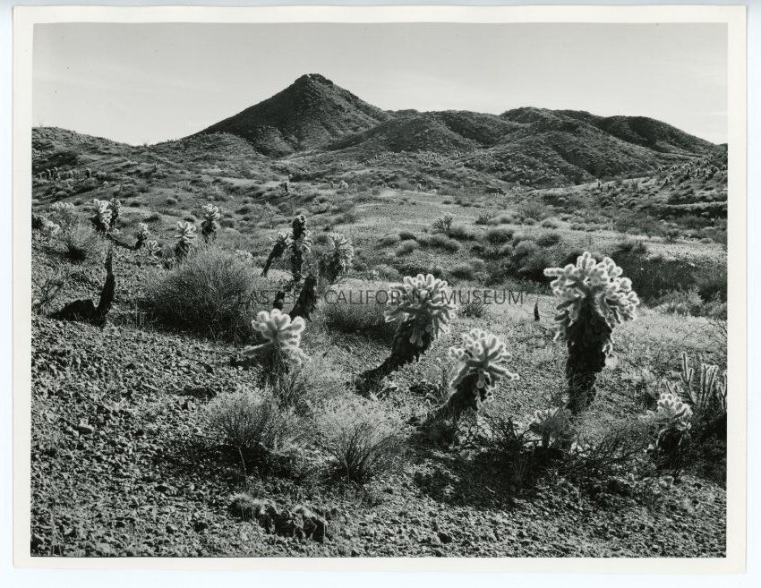 Photo of cacti in the desert. Label on reverse: Cholla (jumping) cactus near Needles. Also has "117" handwritten in red pencil on reverse.