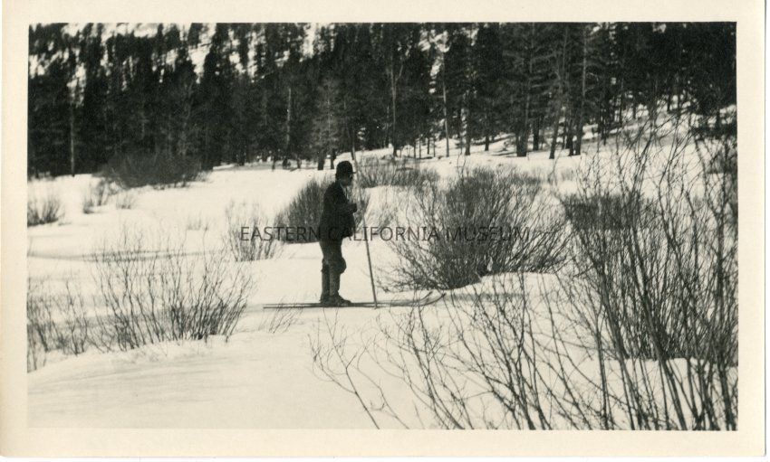 Photo of member of the Cottonwood Creek Snow Survey team on skis holding a measuring pole. Written on reverse: Log No. XX.