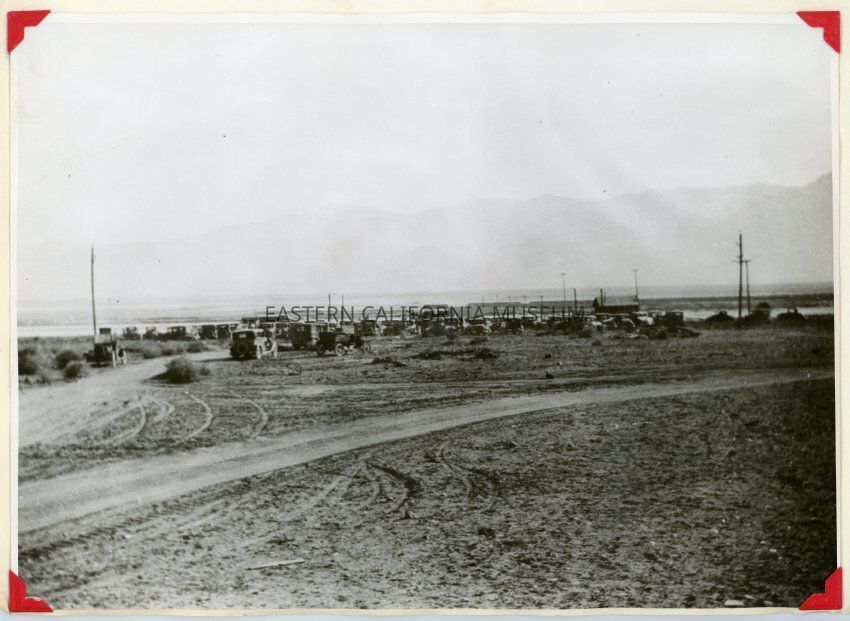 Photo of the dedication of the Keeler Plunge (swimming pool) about 1930. Shows lots of vehicles parked in the dirt, and possibly the Owens Lake in the background. Original courtesy of Margaret Sparovahn of Lone Pine.