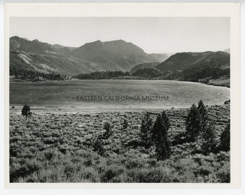 Photo of a mountain lake. No trees around the shoreline. Label on reverse: Grant Lake, off Highway 395, Mono County.