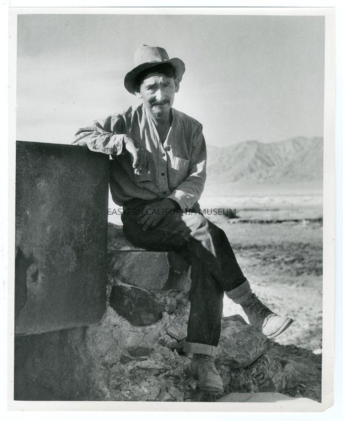 Label on reverse: Tom Wilson, son-in-law of Shoshone Indian Hungry Bill, leans on end of long metal trough, since stolen, that remained at Eagle Borax works. Photo 1934.