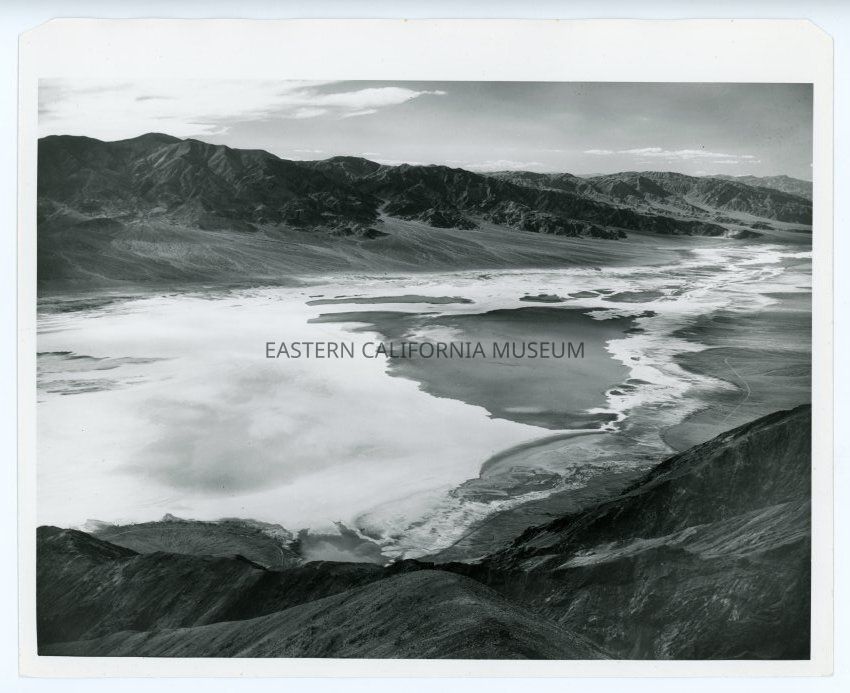 Photo of a shallow lake in Death Valley taken from a high vantage point. The sky/clouds are reflected. Label on reverse: Death Valley from Dante's View.