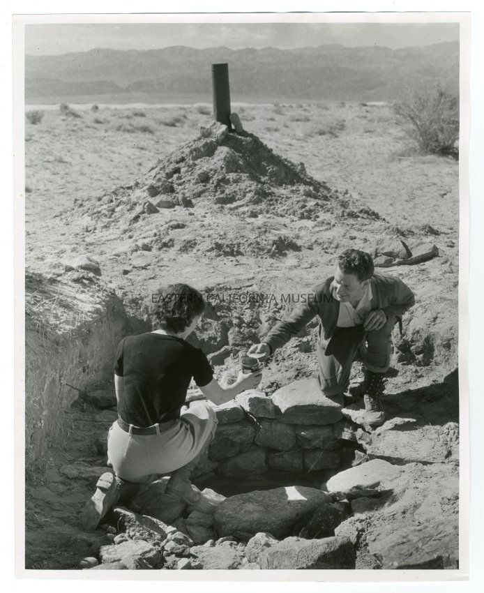 Label on reverse: Two Death Valley visitors sample the water at Stove Pipe Wells. They didn't like it. Photo 1934.