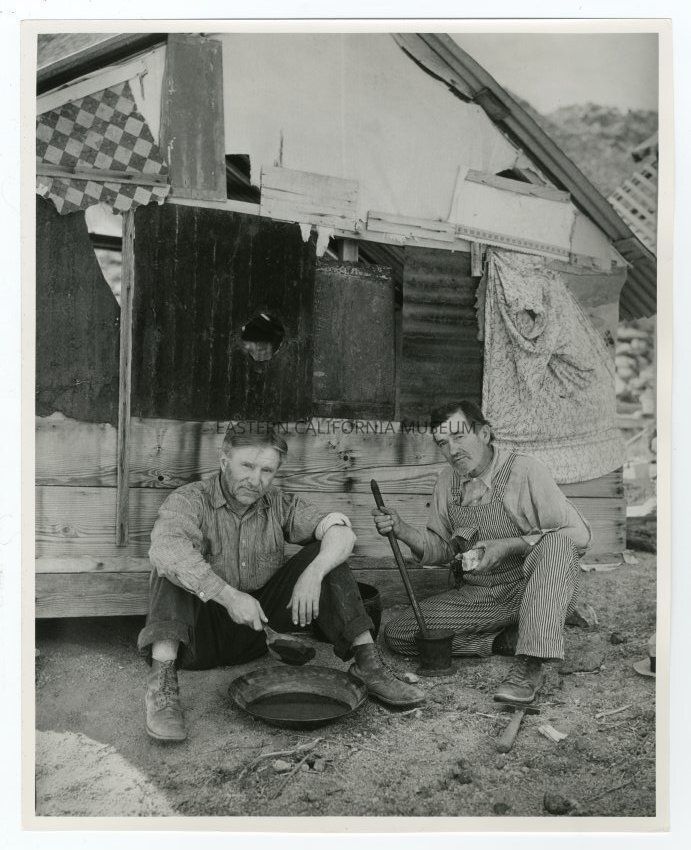 Photo of two men sitting on the ground around a gold pan. Behind them is a shack pieced together with random salvaged material.