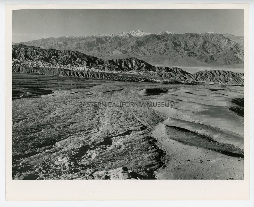 Photo of a desert landscape. Snow-capped mountains in the distance. Label on reverse: Furnace Creek Wash, Telescope Peak in distance, Death Valley, 1934.