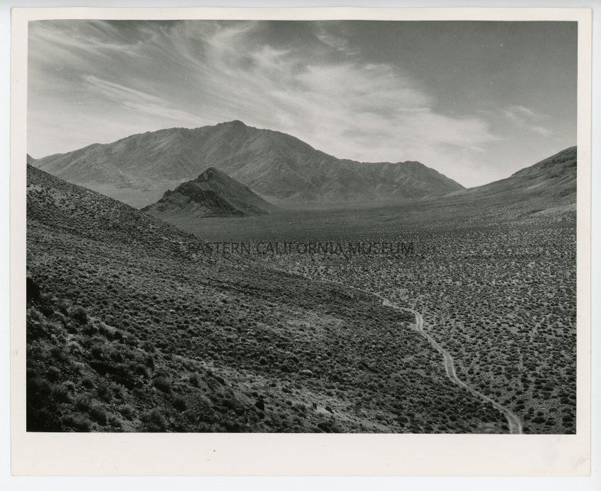 Photo of a dirt road snaking its way through a desert landscape. Label on reverse: Road through Butte Valley, D.V. [Death Valley], said to be old Mormon route. Photo 1934.