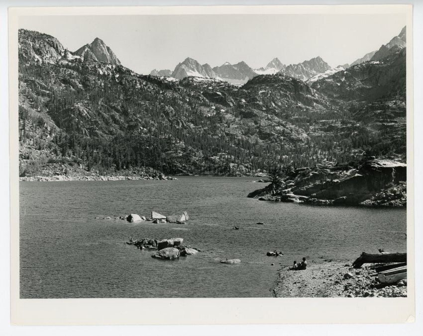 Photo of a mountain lake with snow-capped peaks in distance. A woman and a young child are sitting on the rocking shoreline. There is a tree trunk and possibly a boat on the shore behind them. Unidentified Sierra lake, c. 1930.